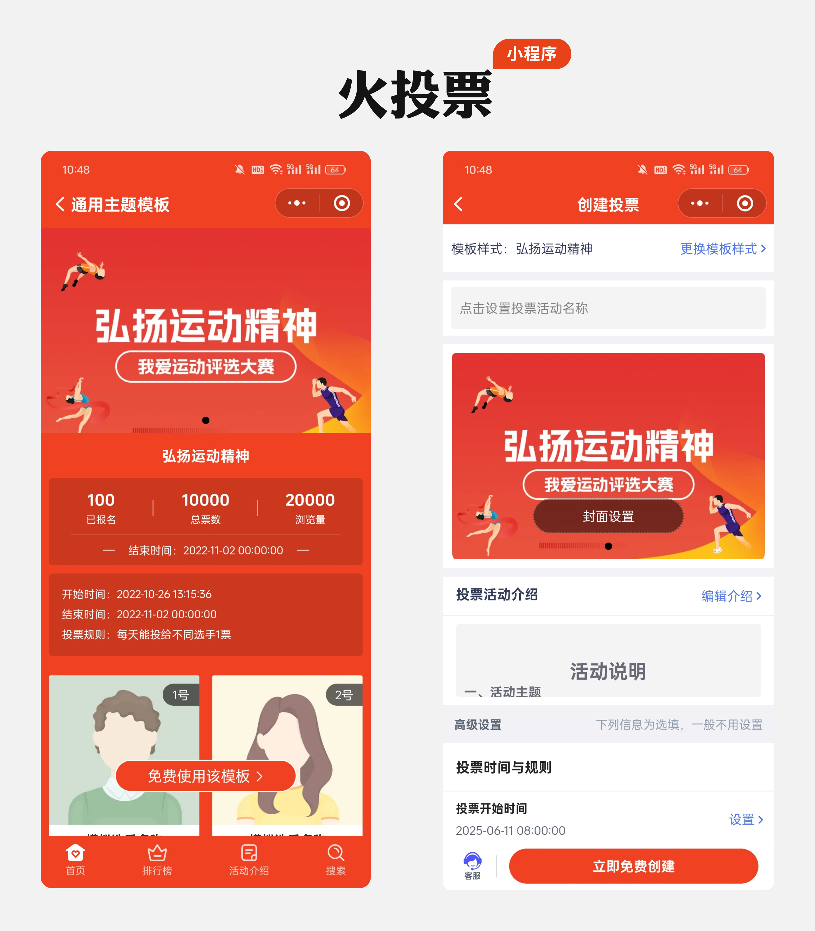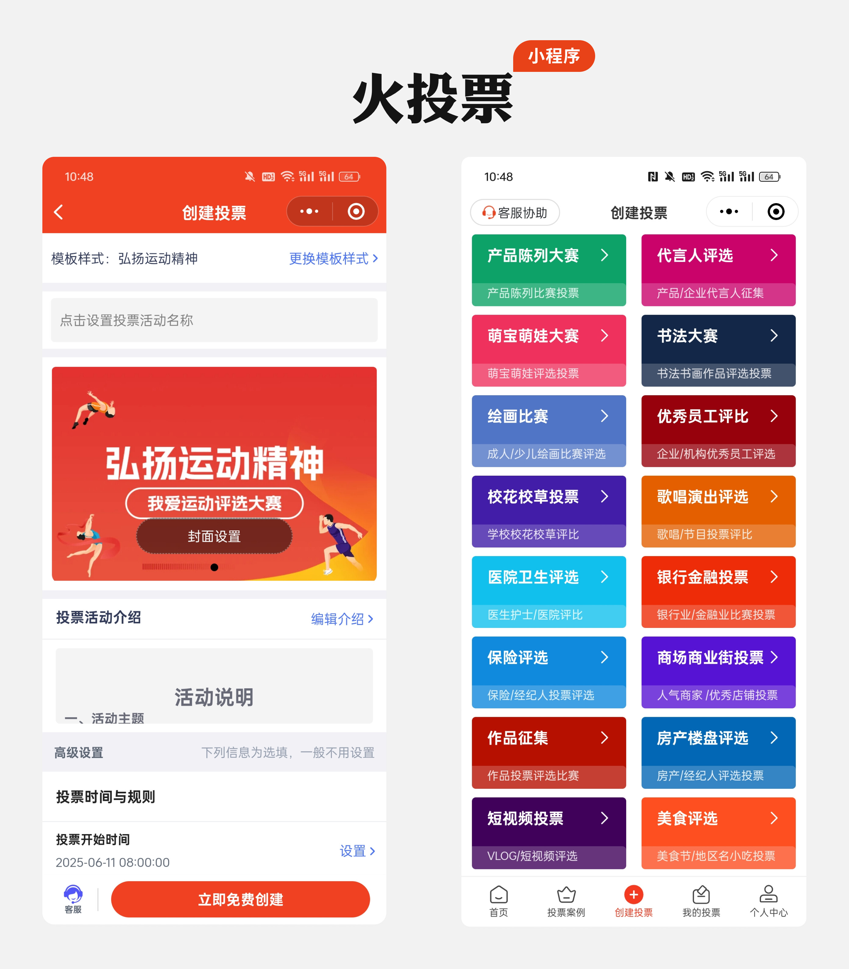 火投票小程序提供了众多通用场景模板,涵盖活动评选、意见征集、赛事投票等常见场景。虽然可能没有专门针对某些特定节日或活动的模板,但用户完全可以根据活动需求选择一个最适合的模板。