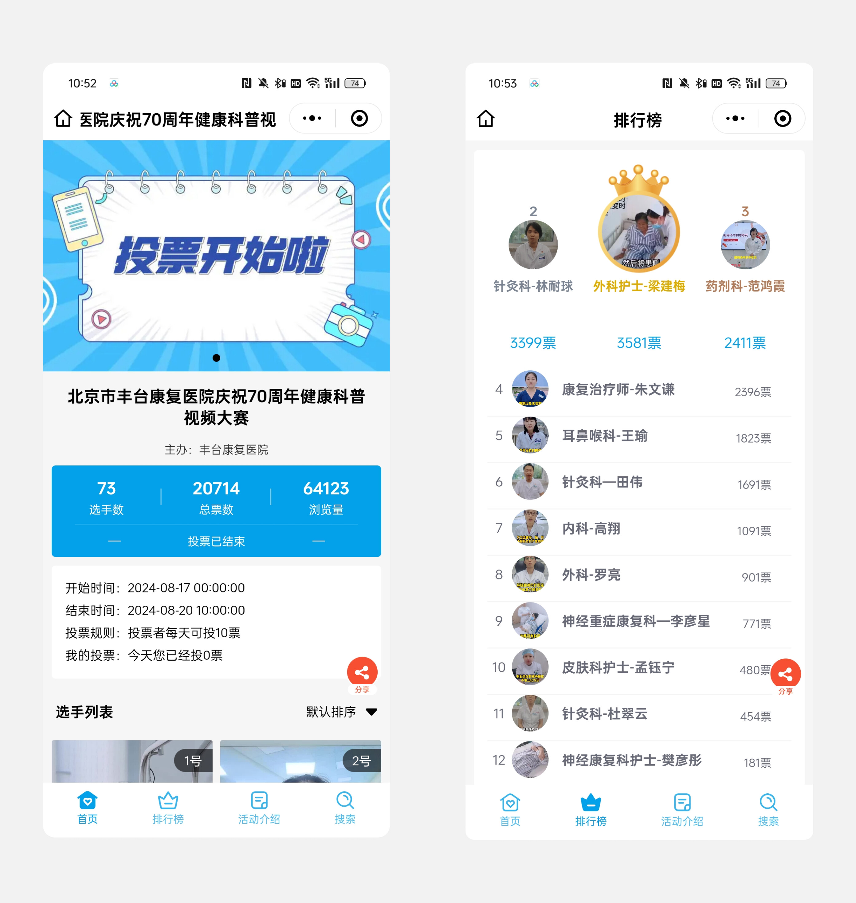 丰台康复医院举办了北京市丰台康复医院庆祝70周年健康科普视频大赛,活动举办期间,票数达到了2万,浏览量达到了6.4万。