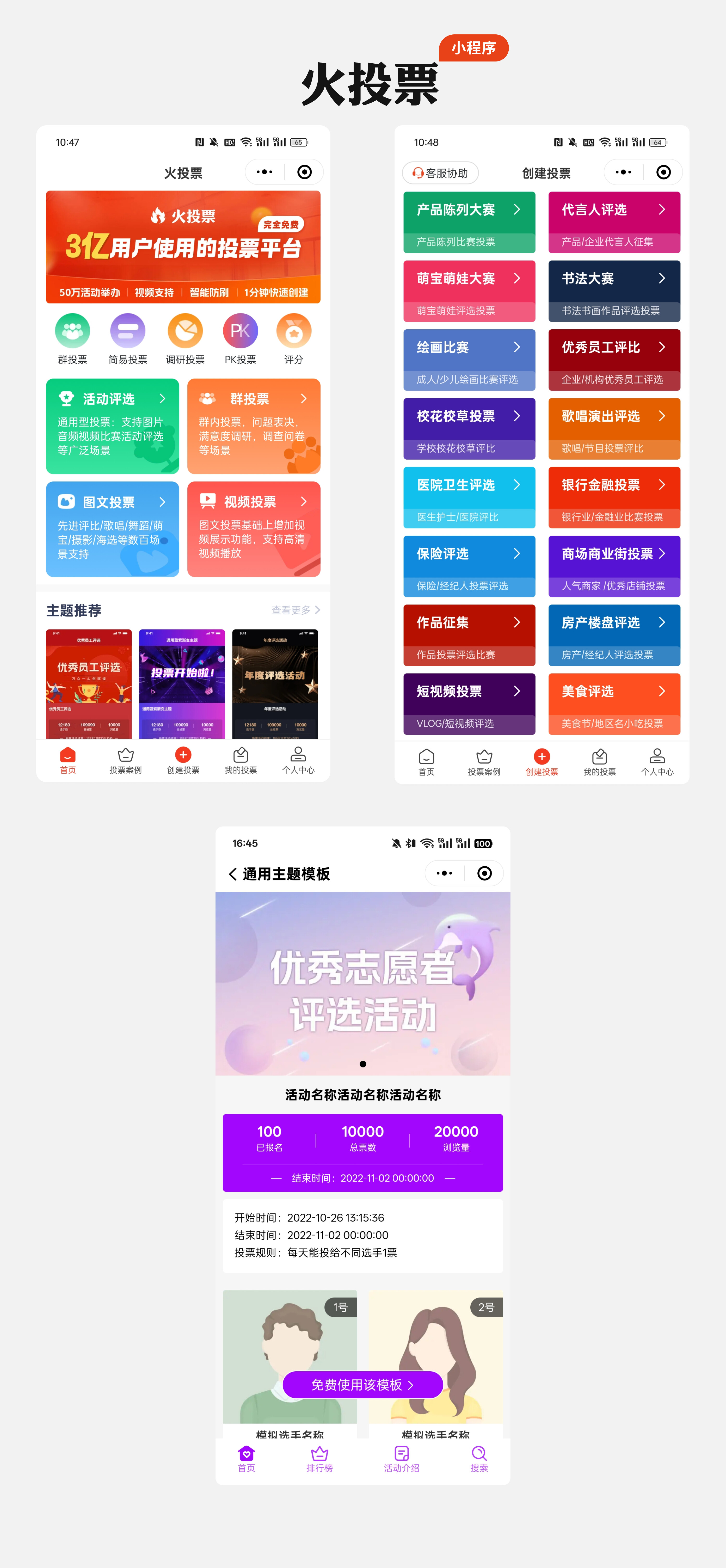 进入火投票小程序后,点击首页中的 “创建投票” 按钮,在海量的投票模板中选择适合优秀志愿者评选活动的模板,然后即可开始创建优秀志愿者评选活动。