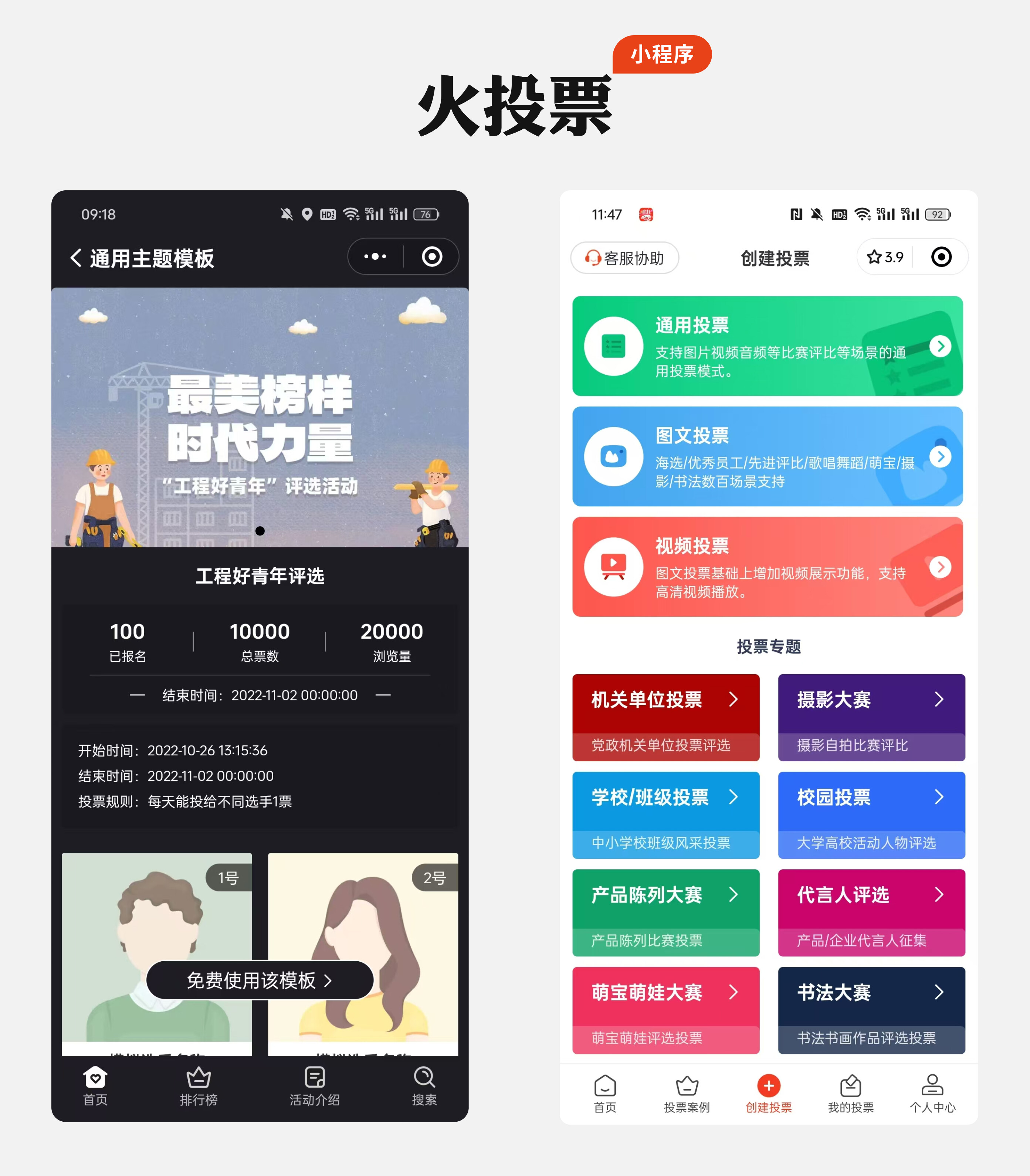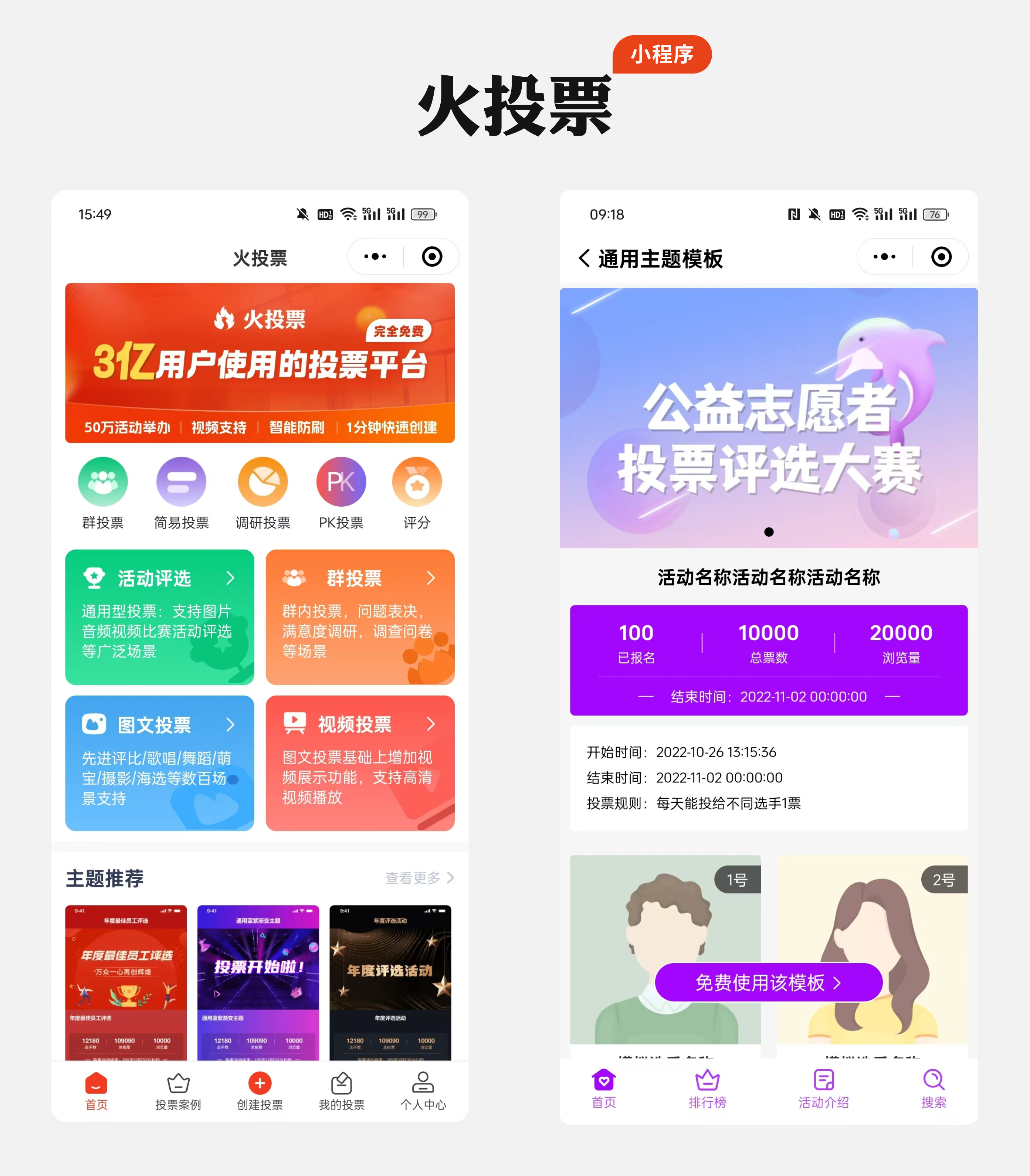 模板选择:小程序提供“图文投票”“视频投票”“多选投票”等免费模板,可根据活动形式选择。
