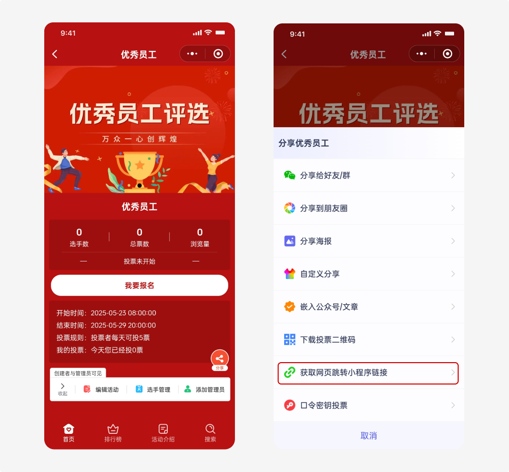在投票加加小程序中,只需要分享投票链接,就能邀请他人参加投票活动。