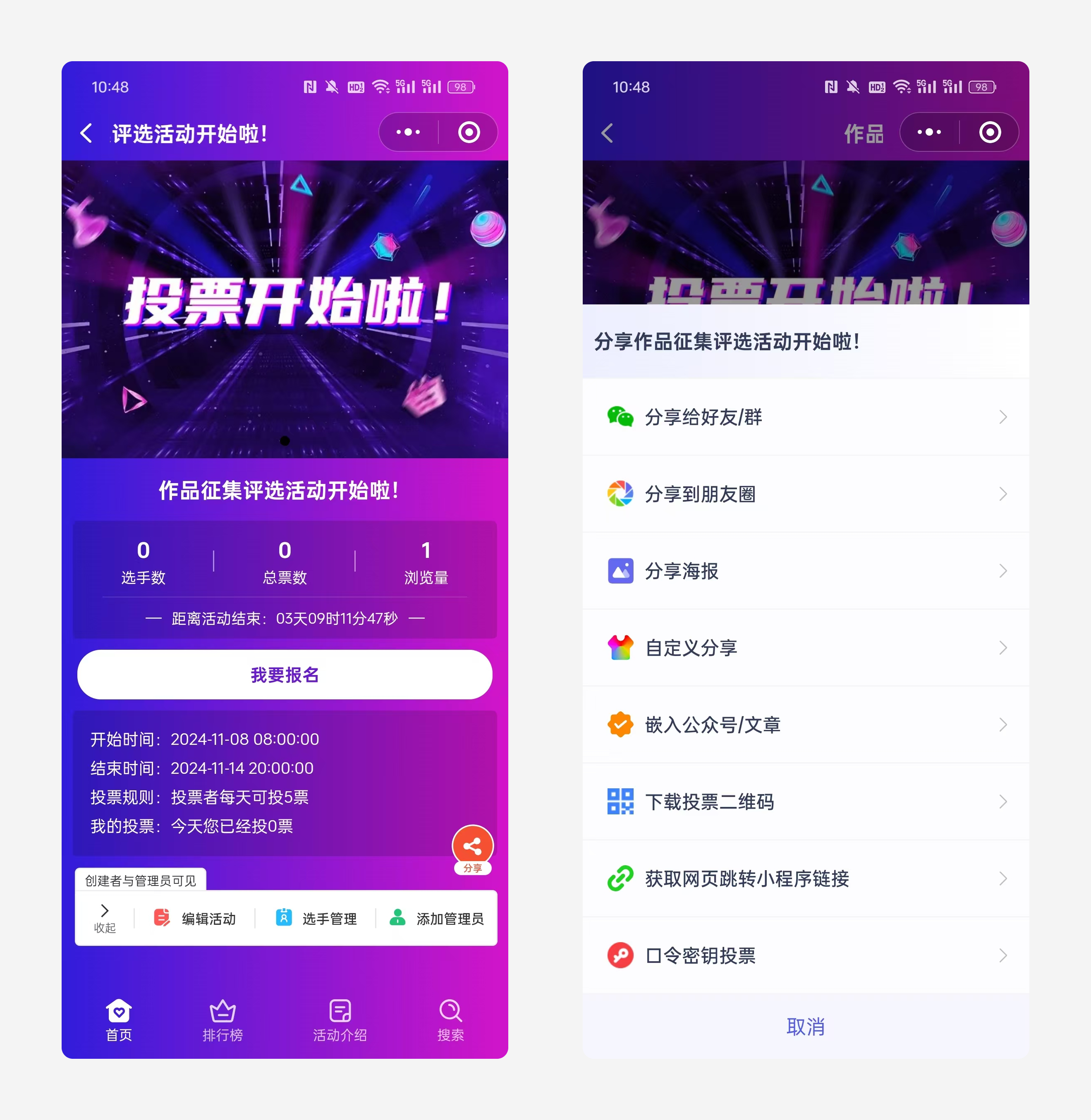 点击 “分享” 按钮,选择 “朋友圈”,搭配一句简短文案(比如 “快来为你支持的选手投票呀~ 点击链接就能投,感谢大家参与!”);